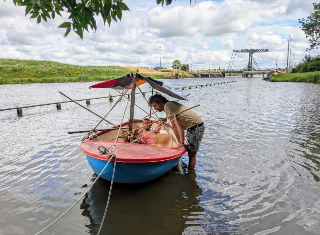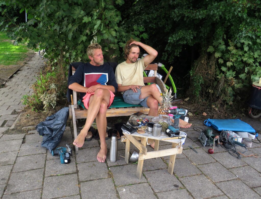 Beiden hebben deze warme julidag hun eigen projectje. Fabian (31) monteert in het pierenbad een hangmat in zijn Leukothea, zijn kleine zeilbootje. Wietse (29) knapt zijn oude bakfiets op.