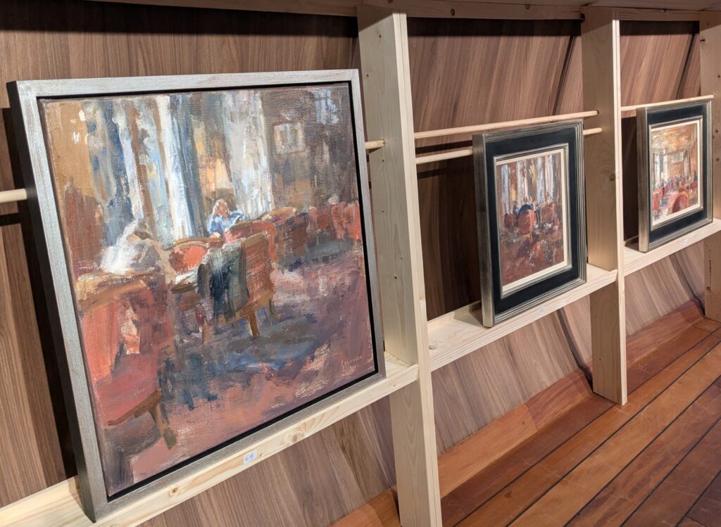 Tjalk De Goede Verwachting (1902), de blikvanger tussen het restaurant en de brug, wordt inmiddels alleen nog gebruikt als expositieruimte. Tot 3 februari hangen er werken van Kees van den Bos (bloemen) en Flip Gaasendam (landschappen en interieurs). Daarna vult de Warffumer kunstenaar Gerard Oostra de sfeervolle ruimte met zijn aquarellen.