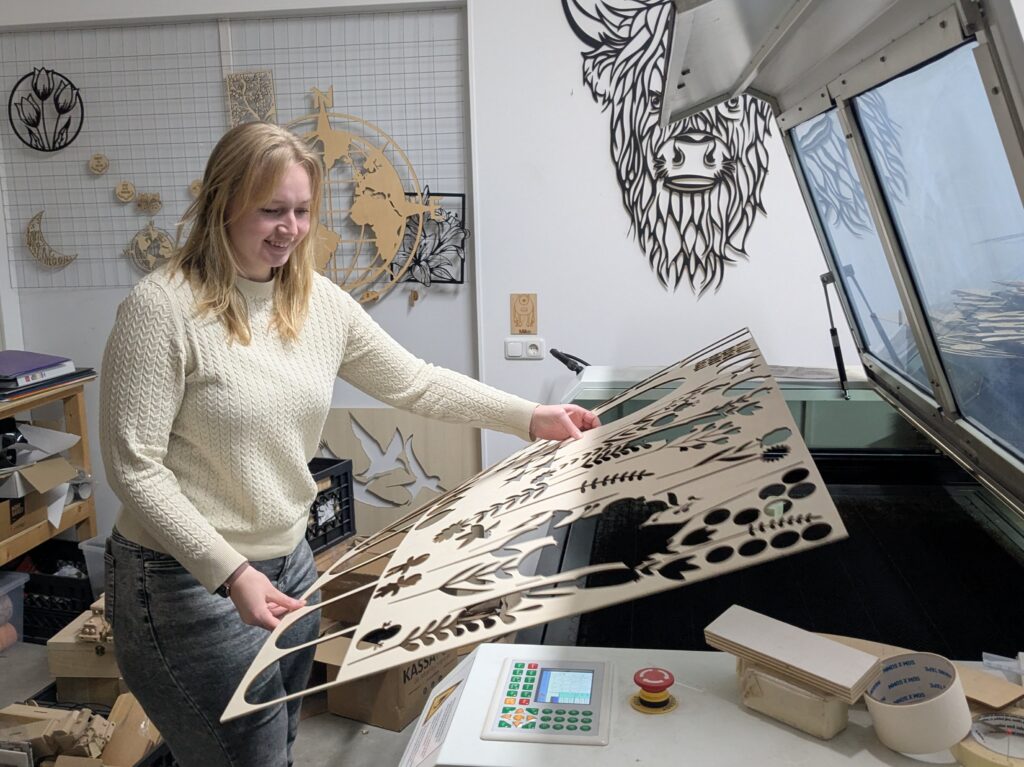 ´Ik maak de bestandjes op de laptop en stuur ze naar de laser. Gaat er iets mis, dan weet ik zeker dat het aan mij ligt´, zegt ze lachend. ´De machine doet altijd wat ik vraag.´